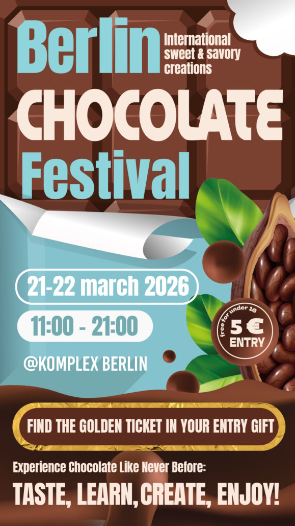 Das Berlin Chocolate Festival fand im März 2026 im Napoleon Komplex in Friedrichshain statt und hatte eine große Auswahl an internationalen Kakao-Spezialitäten. Besucher freuten sich auf kreative Streetfood-Variationen, bei denen Schokolade sogar in herzhaften Gerichten wie Pasta oder Burgern verwendet wird. Neben dem Marktplatz gab es ein abwechslungsreiches Programm mit Masterclasses, Live-Cooking-Shows und Workshops für Kinder und Erwachsene.